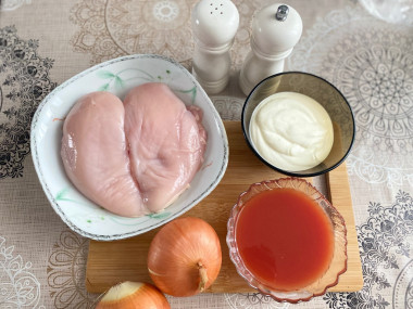 Калорийность продуктов: Куриное филе, Сметана, Томатная паста, Лук репчатый, Пшеничная мука, Горчица, Соль, Перец, Растительное масло