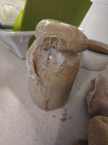 Для начала я взяла банку объёмом 0,5 литров и уменьшила пропорции рецепта вдвое, но уже на 3 день закваска хотела "убежать", поэтому я половину массы переселила в новую литровую баночку и продолжила ее выращивать.