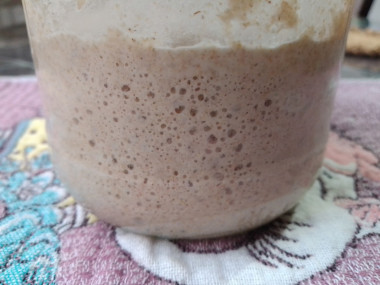 Делала по такой технологии - все получилось с первого раза. Сейчас в холодильнике живет. Я ржаную закваску во время подкормки не отогреваю - просто добавляю мучную кашицу и обратно убираю.