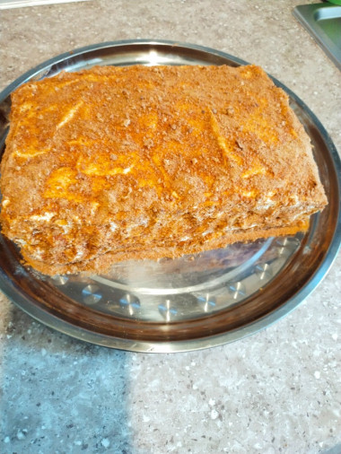 Таким образом приготовьте все коржи, складывая один на другой и оставляя под прессом. Дайте им остыть и выстояться. Минимум 1-2 часа, а лучше всего — ночь. Объема указанных ингредиентов хватает на 7-8 коржей небольшого прямоугольного тортика 12 на 18 см.