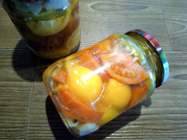 Великолепная овощная заготовка, которая нас очень порадовала своим вкусом. Помидоры не разваливаются, они очень нежные и вкусные. Сладкий перец получился хрустящим. Кольца лука слегка мягкими, а чеснок отлично промариновался. Очень вкусные и острые получились овощи, а маринад вообще обалденный. Буду ещё готовить по такому рецепту и всем советую попробовать. Благодарю автора!