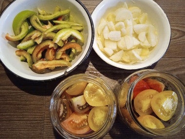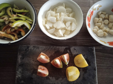 Овощи вымойте, удалите плодоножки, а из перцев еще и семена. Помидоры порежьте на дольки, перец - соломкой. Лук и чеснок почистите, нарежьте лук полукольцами, а зубчики чеснока оставьте целыми.