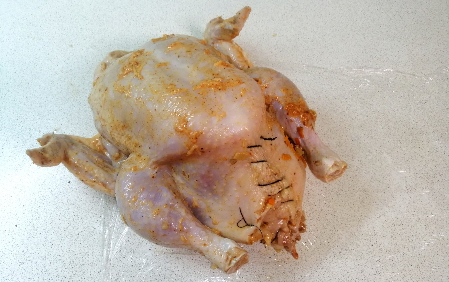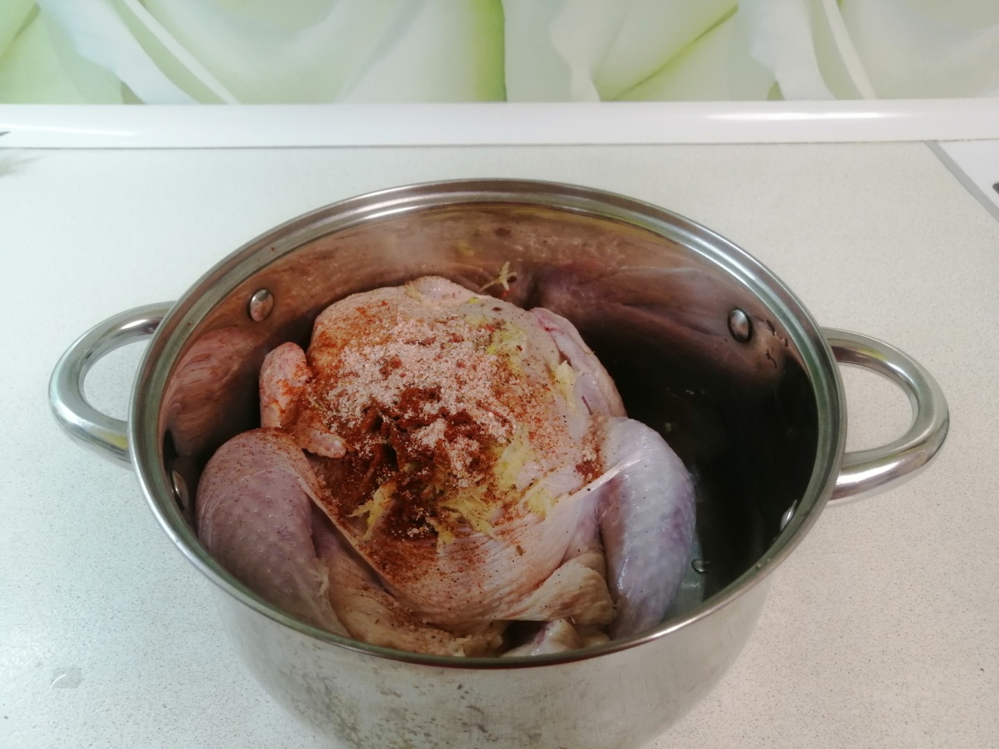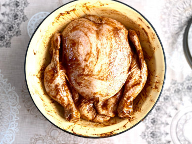 Делала все по рецепту, для маринада взяла 1 столовую ложку растительного масла, 2,5 чайных ложки соли и по чайной ложке паприки и хмели-сунели, так удобно натирать тушку, курица у меня была 2,6 кг.