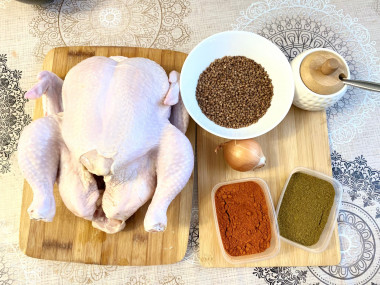 Как запечь курицу, фаршированную гречкой, в духовке? Подготовьте необходимые ингредиенты. Курицу лучше выбирайте небольшого размера. У меня тушка весом 1350 граммов.