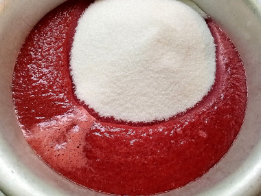 Переложите вишню в кастрюлю, залейте водой и доведите до кипения. Варите их 5-10 минут на слабом огне, пока они не станут мягкими. Затем остудите и протрите ягоды через сито, прокрутите через мясорубку или взбейте блендером.