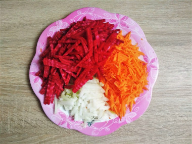 Как сделать заправку для борща на зиму без капусты? Свежую, яркую свеклу, без потёртостей и вмятин вымойте со щёткой под проточной водой. Овощечисткой снимите кожуру и натрите на крупной тёрке. Можно порезать свёклу ножом на брусочки.