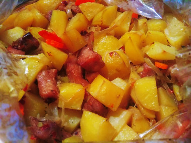 В конце приготовления можно рукав разрезать и дать блюду немного подрумяниться в открытом виде. Свинина с картошкой готова! Разложите на тарелки и подавайте к столу в горячем виде! Приятного аппетита!