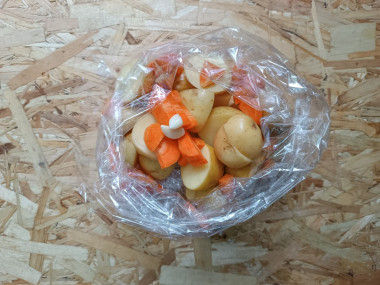 Лук и морковь очистите и ополосните. Лук нарежьте полукольцами, а морковь кружочками или брусочками. Выложите лук и морковь в рукав к картофелю.