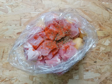 Как сделать свинину с картошкой в рукаве в духовке? Подготовьте для этого необходимые ингредиенты. Картофель очистите от кожуры и ополосните от загрязнений. Свинину выбирайте с небольшим количеством жира, тогда в готовом блюде она будет сочнее. Я использую для приготовления свиную шею.