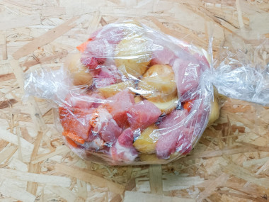 Рукав для запекания необходимо герметично завязать с одной стороны. Для этого используются специальные завязки или зажимы, которые продаются вместе с рукавом. Очищенный картофель нарежьте крупными кусочками и выложите в рукав.
