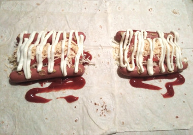 Сосиски покупала варёные с вкусной корочкой, поэтому не отваривала. Вместо корейской моркови использовала белокочанную капусту, тонко нашинковав. На 1 хот-дог брала 1 лист армянского лаваша и 2 сосиски. А ещё добавила чуток горчички, мы любим остренькое. Хот-доги я не обжаривала на сковороде по своим причинам, а хорошо нагревала в микроволновке по 2 минуты, чтоб расплавился сыр. Нет у меня на лаваше румяной корочки, но на вкус это совершенно не повлияло. Приготовление не занято и 15 минут. Очень всё просто.