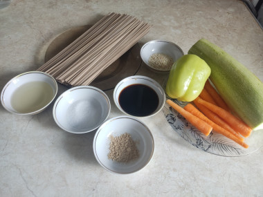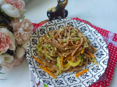 Подготовила все ингредиенты. Овощи помыла,нарезала соломкой. В сковороде обжарила морковь, перец, кабачок. В это же время отварила гречневую лапшу буквально несколько минут. К овощам добавила лапшу, специи,соевый соус,перемешала и все вместе потомила несколько минут. Готовое блюдо посыпала кунжутом!