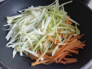 Кабачок помойте, высушите. Если кожа слишком толстая, то снимите ее при помощи овощечистки. Нарежьте кабачок таким же способом, как и морковь.