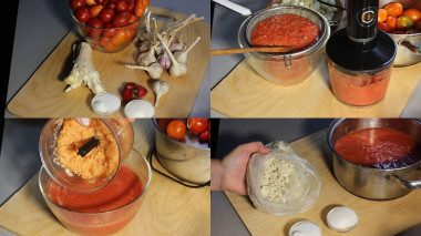 Пропустите помидоры через мясорубку или пробейте их блендером. Зубчики чеснока очистите и также пропустите через мясорубку, пресс или натрите на терке. Корни хрена чистите и также пропустите через мясорубку или натрите на терке. Чтобы избежать распространения едких паров от корня хрена при измельчении, на выходное отверстие мясорубки можно надеть резинкой пакет и зафиксировать его. При использовании терки придется немного потерпеть.