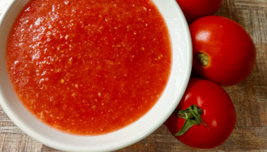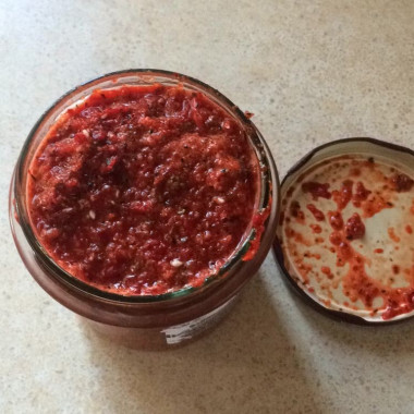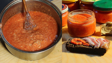 Помидоры, перебитые в блендере и очищенные от кожицы и семян, сохраняют свою свежесть и сочность, а хрен и чеснок добавляют остроту и пикантность. Эта закуска идеально подходит для намазывания на хлеб, создавая насыщенный и яркий вкус. Она также прекрасно сочетается с горячими блюдами, такими как щи, борщ, пельмени и холодец, добавляя им остроты и свежести.