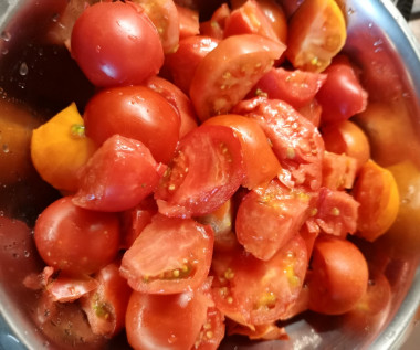 Нарежьте помидоры на кусочки, вырезая место крепления плодоножки. Если кажется, что шкурка у томатов толстая и жесткая, будет портить своим присутствием соус, можно ее снять, обдав помидоры кипятком, а потом опустив в холодную воду.