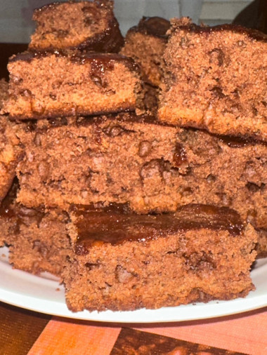 Разогрейте духовку до 180С. Застелите пекарской бумагой форму для запекания. И перелейте тесто в форму. Моя размером 20 на 30 сантиметров. Запекайте пирог в прогретой духовке около 45 минут. Точное время определяйте сами, ориентируясь на тип своей духовки!