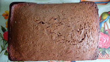 Теперь поверх горячего испеченного коржа вылейте содержимое того стакана, куда мы сливали шоколадную массу в пятом шаге.