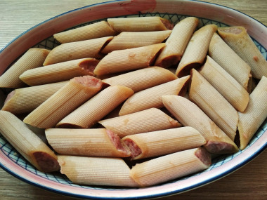 Сырые рожки плотно наполните фаршем и выложите в один слой потеснее друг к другу в форме для запекания. Форму берите побольше, на всю площадь духовки можно.