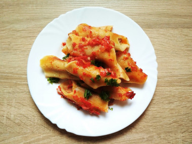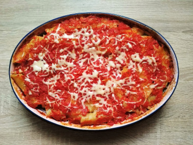 ), нафаршировала и выложила их в форму в два слоя друг на друга. Помидоры не стала резать дольками, а перекрутила через мясорубку и прожарила вместе с луком. Затем этой поджаркой густо залила макароны в форме. Во время приготовления дважды подливала в форму воду, она быстро выкипала несмотря на то, что форма была прикрыта фольгой. Готовила в духовке более часа, при этом макароны получились по степени готовности "аль денте". Сыром присыпала совсем чуть-чуть, для лёгкого привкуса. Получился вкусный ужин. Отличное блюдо и хороший рецепт, но всё же в следующий раз буду так же, как и раньше, слегка отваривать макаронные изделия перед тем, как начинять их фаршем.
