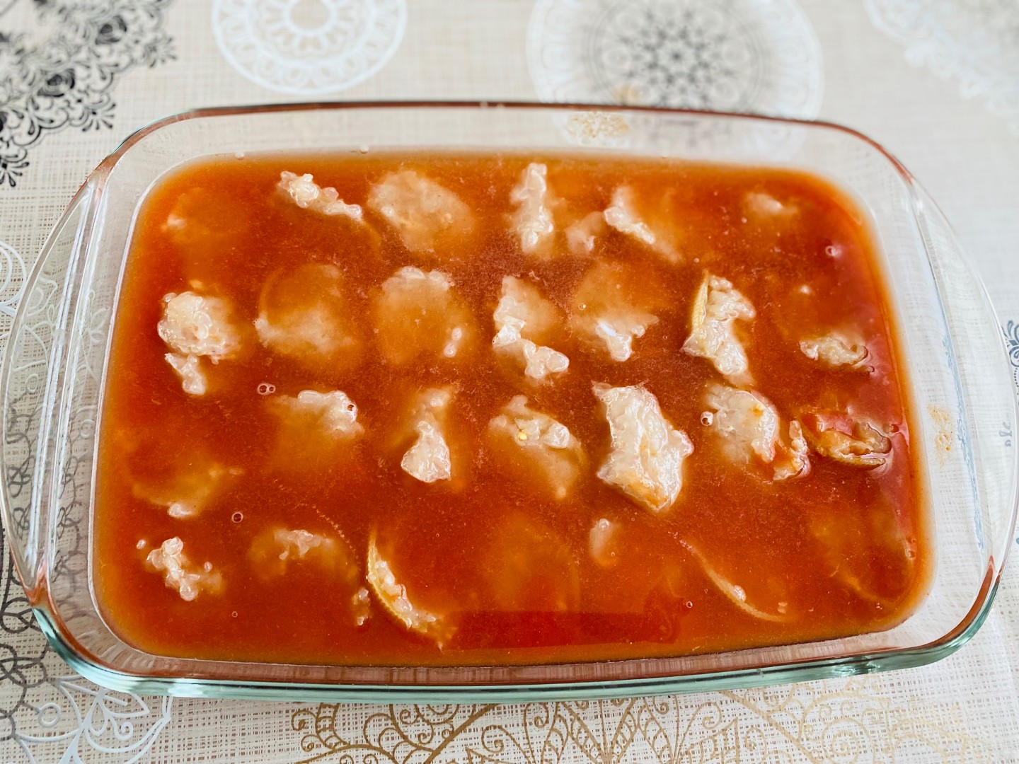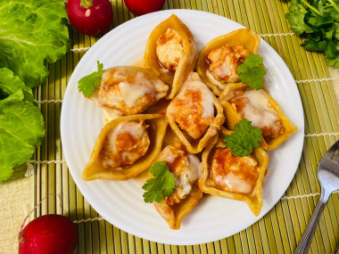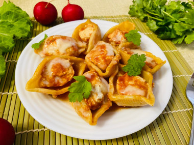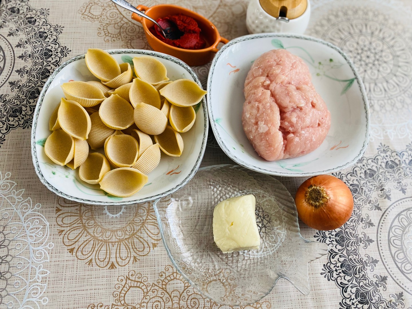 Вместо рожек взяла ракушки, фарш из куриного филе, а вот воду решила заменить томатным соусом.