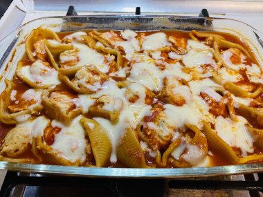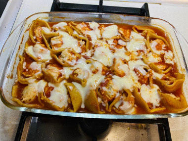 Залила ракушки томатным соусом и закрыла форму фольгой, до готовности на температуре 180 градусов блюдо дошло за 60 мин. Сняла фольгу, посыпала моцареллой и через две минуты уже звала своих ужинать.