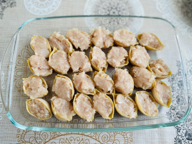 Кстати делал фарш и фаршировал ракушки мой сын, так что берите на заметку, привлекайте своих детей, это не сложно, но вам будет весело.