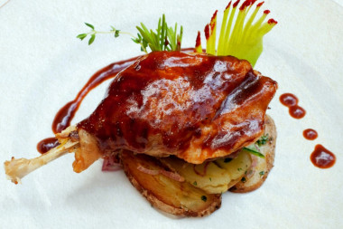 Утиные ножки конфи дополните картофельным пюре и ягодным соусом (у меня вишневый), украсьте веточками розмарина и подайте к столу. Приятного аппетита!