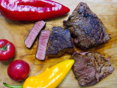 Как пожарить сочный стейк из говядины рибай на сковороде дома? Подготовьте все необходимые ингредиенты. Чтобы мясо прожарилось равномерно по всему куску, говяжий стейк заранее достаньте из холодильника и оставьте при комнатной температуре не менее, чем на 1-2 часа. Мясо должно быть и внутри, и снаружи одинаковой температуры. Нежелательно готовить стейк из замороженного мяса - он не получится таким же сочным и мягким, как из свежего.