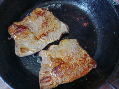 Накройте сковороду крышкой и оставьте мясо на 1-2 минуты, чтобы все соки распределились по куску равномерно. Можете вместо сковороды переложить мясо на тарелку и накрыть фольгой.