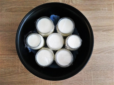 Чашу заливаем теплой водой (40 градусов) до уровня молока в баночках. Закрываем мультиварку, выбираем режим "Йогурт". Время приготовления зависит от модели вашей мультиварки, но обычно оно составляет 8 часов. Удобно ставить йогурт готовиться в ночь.