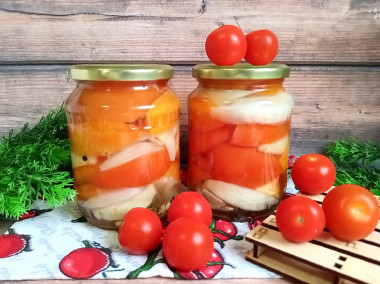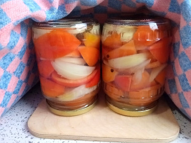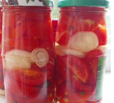 Рецепт салат из помидор без стерилизации на зиму меня очень выручил. У меня выросли большие помидоры, которые не влезают в банку, и я сделала маринованные помидорки дольками с луком на зиму. Очень вкусно! Большое спасибо за рецепт!
