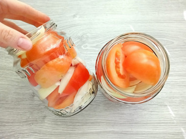 Затем слоями разложите по банкам помидоры и лук. Сильно банки не набивайте, чтобы помидорные дольки не поломались. Если вы любители лука, то можете положить его еще больше. Мои полкило помидор уместились в две полулитровые банки.