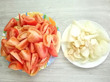 Помидоры выбирайте сочные, но плотные. Мягкие плоды плохо держат форму, в процессе нарезки и приготовления они расползутся в бесформенную массу и испортят внешний вид блюда.
