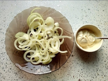 Возьмите плоскую тарелку. Первым слоем выложите на нее замаринованные кольца лука.