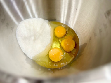 Взбейте яйца с сахаром на высоких оборотах миксера до пышной, светлой массы. Когда в процессе взбивания венчики миксера будут оставлять видимые, четкие следы, значит, яйца взбились достаточно хорошо и можно прекратить взбивание.