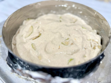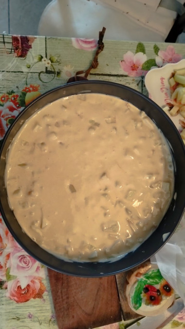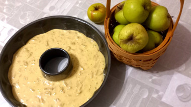 Вылейте остальное тесто, аккуратно разровняйте. Можно сразу выложить все яблоки в тесто и перемешать.