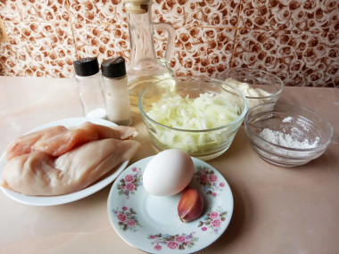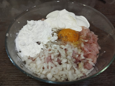 Подготовленное куриное филе соедините с яйцом, крахмалом, сметаной, нарезанным репчатым луком. Посолите, добавьте черный молотый перец.