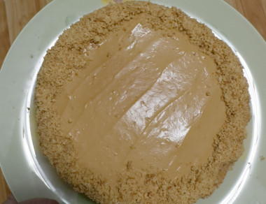Бока и края торта обсыпьте крошкой. Сверху можете нанести растопленный шоколад из кондитерского мешка. Поставьте торт в холодильник на ночь для пропитки. На следующий день подайте торт Коровка с вареной сгущенкой и арахисом к столу. Приятного аппетита!