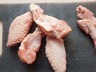 Крылья вымойте и обсушите бумажными салфетками. Разрежьте крылышки на 3 части. Кончики крыльев уберите, они для рецепта не потребуются.