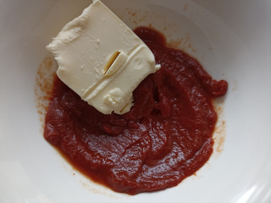 В небольшую чашку отправьте масло и томатную пасту. Перемешайте, насколько это возможно. Однородной массы на данном этапе добиваться необязательно.