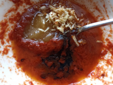 Очищенный и пропущенный через пресс чеснок добавьте ко всем компонентам в миске. Следом отправьте в чашу мёд. Всё хорошо вымешайте до однородного состояния. Отправьте в микроволновку еще на 30 секунд. Ещё раз перемешайте. Добавьте винный уксус. Попробуйте соус на вкус. При необходимости добавьте немного соли или вустерского (соевого) соуса, чтобы получить желаемый сбалансированный вкус.