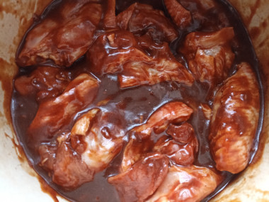Залейте крылышки томатным маринадом и оставьте на 1-1,5 часа при комнатной температуре.