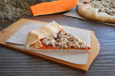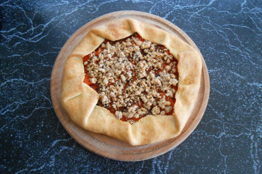 Для орехового штрейзеля нужно перетереть руками в крошку 10 г мягкого сливочного масла, 1 щепотку соли, 1 ст.л.муки, 15 г измельчённых ядер грецких орехов, 1 ст.л.сахара. Перед выпечкой посыпать начинку штрейзелем.
