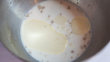 Дрожжевую массу перелейте в чашу, в которой будете замешивать тесто. Влейте к ним теплое скисшее молоко.