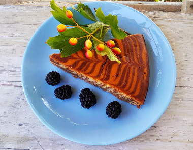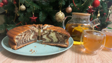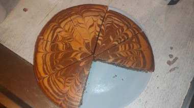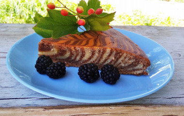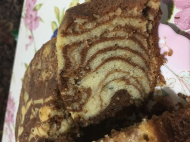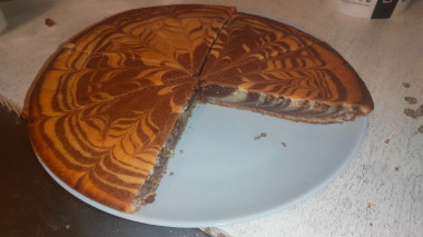 "Зебру" я пекла много раз, но по другому рецепту, со сметаной и без сливочного масла. Попробовала приготовить по этому рецепту. Пирог мне понравился, он в меру влажный, мягкий, не приторный, приятной шелковой консистенции. На вкус очень похож на шоколадный кекс) Когда пирог выпекался, на кухне витал шоколадно-ванильный аромат, люблю, когда в доме пахнет выпечкой. Пирог у меня получился пониже, наверное потому, что я взяла широкую форму. На вкус это не повлияло, конечно. Дети съели половину пирога еще в теплом виде) Рецепт рекомендую всем, очень вкусный пирог получается)