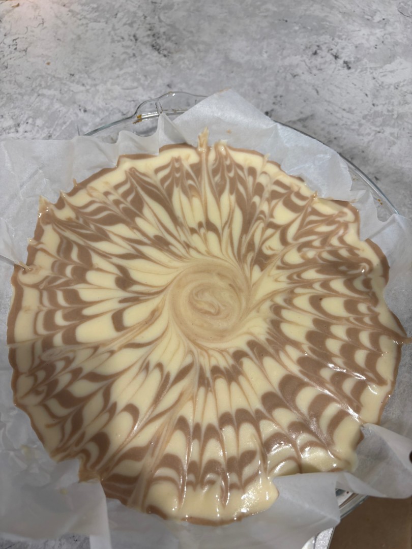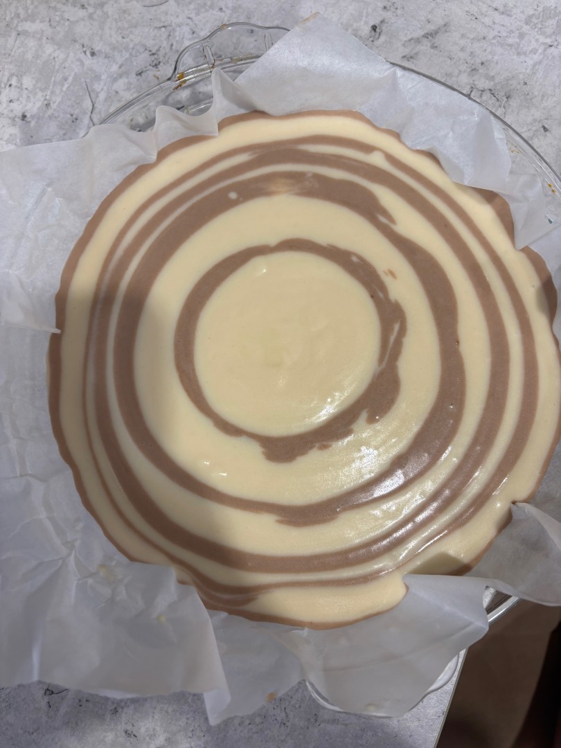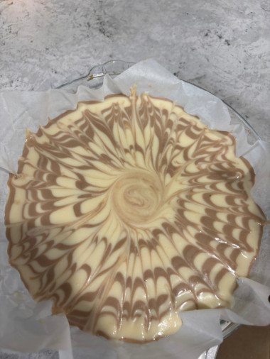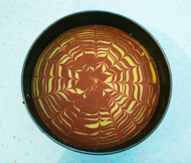 Форму для выпечки (диаметром 20-22 см) застелите пергаментом и смажьте сливочным маслом. В центр вылейте 2 ст. л. белой массы, затем 2 ст. л. шоколадной массы. Чередуя оба вида теста, заполните всю форму. Чтобы круги были ровнее, ложку нужно держать строго вертикально.
