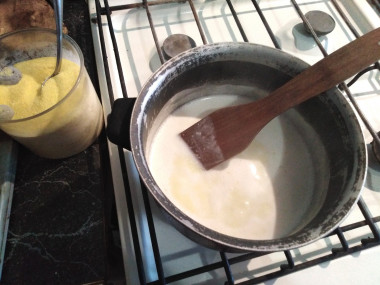 Крупу хорошо промойте - до тех пор, пока вода не будет литься прозрачной. При необходимости удалите мусор и посторонние примеси. Кукурузная крупа бывает двух видов: очень мелкая, которую используют для приготовления поленты, и более крупная, структурная. Для приготовления этого блюда вы можете взять любой вариант крупы. Я взяла более крупный вид. Всыпьте крупу в кипящее молоко.