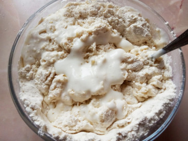 3. Муку просеиваем и добавляем к кефирной смеси небольшими порциями, вливаем растительное масло и вымешиваем тесто. Месить нужно, пока оно не станет плотным и однородным. В зависимости от жирности кефира и качества муки её может понадобиться чуть больше или чуть меньше. Чем жирнее кефир, тем меньше муки понадобится.