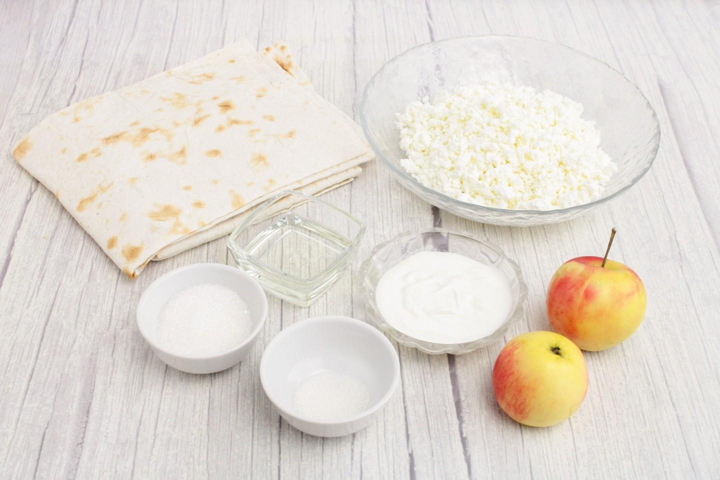 Подготовьте необходимые продукты. Сметану и творог можно взять любой жирности. Яблоки выбирайте сладких сортов. О выборе лаваша, творога и яблок для начинки читайте в статьях по ссылкам после описания шагов. Растительное масло используйте без запаха.